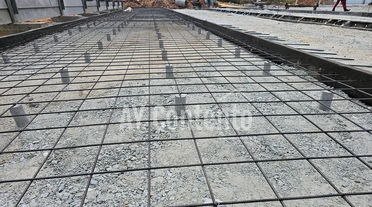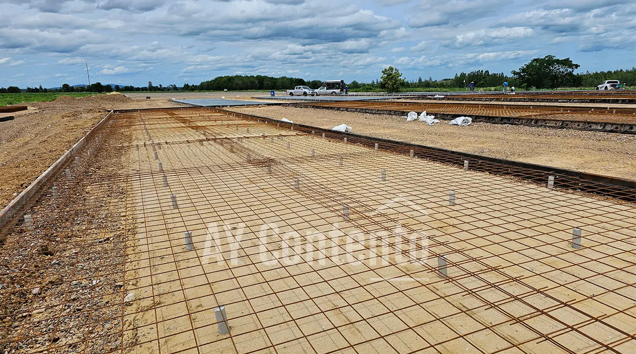 - วางตะแกรง: ปูตะแกรงเหล็กไวร์เมช หรือผูกเหล็กเสริมตามแบบ
